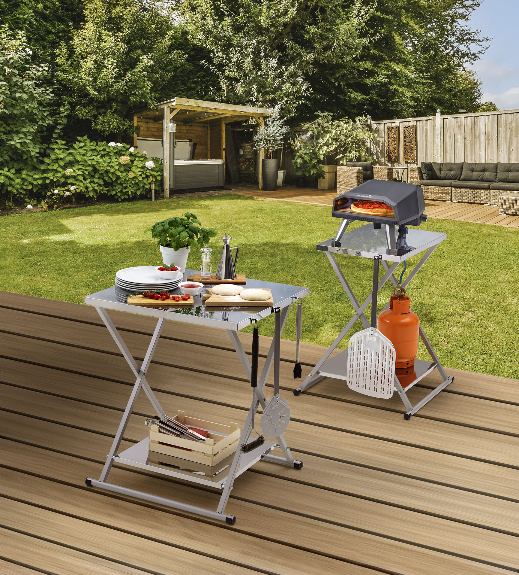 Tavolo pieghevole. Piano superficie in acciaio inox spessore 1,2mm, completo di porta utensili e staffe blocca forno. Ripiano inferiore in acciaio inox 1,2mm. Telaio verniciato a polvere resistente alle intemperie