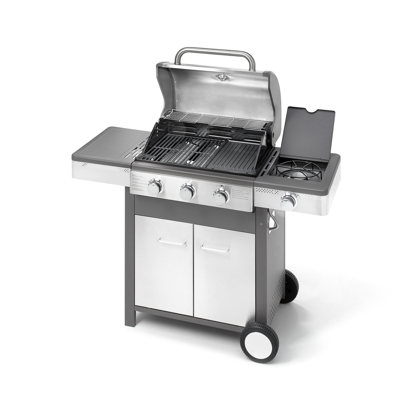 Camera di combustione in acciaio smaltato, coperchio completo di termometro, mensole laterali, pannello di controllo e porte armadietto in acciaio inox. Griglia riscalda vivande in acciaio Inox da 55×12 cm. N. 3 Bruciatori in acciaio inox a una rampa con sopra tegolino frangifiamma (3×3,6 kW). Fornello laterale con bruciatore in acciaio inox (1×2,15 kW). Accensione elettronica.